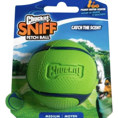 Sniff Fetch Ball Pelota Chuckit es el juguete ideal para que tu perro disfrute buscando, jugando y oliendo. Diseñada especialmente con aromas irresistibles a bacon y maní, esta pelota estimula el instinto natural de búsqueda y diversión de tu mascota.